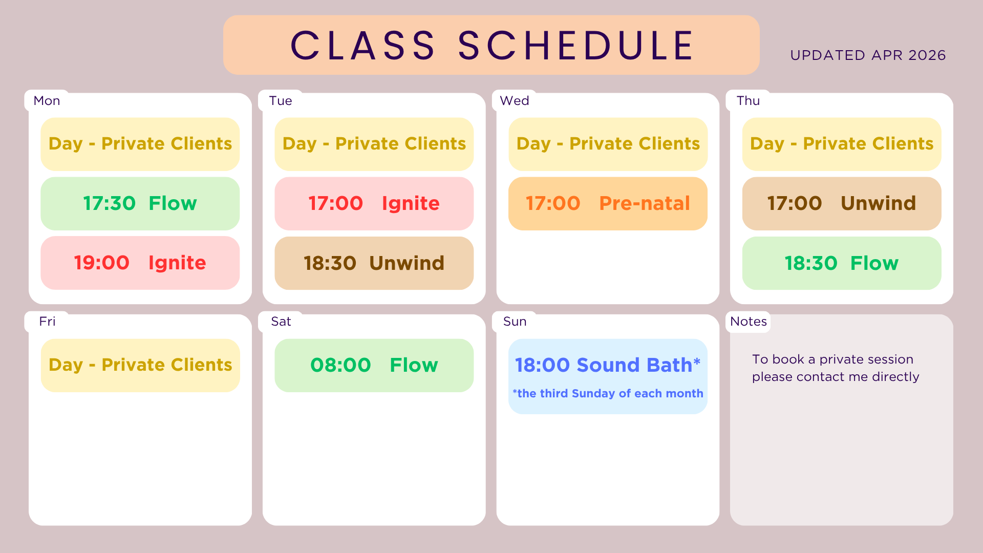 Here you can view the full class schedule, along with availability for private sessions.